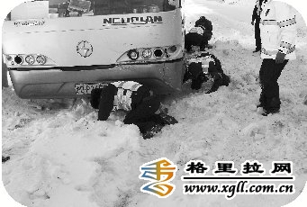因雪山多处路段严重结冰,57分钟后民警终于到达客车被困地点,民警发现,一辆“沪”字牌照的大客车因车身打滑后撞向右边防护栏,陷入深雪中无法前行。考虑到车内大多为高龄老人,德钦交警大队民、辅警先将车内老年人安置于空旷安全地点,随后通过人力推动后发现车辆无法动弹,便立即清扫积雪、撒尘土,使车轮有更好的附着力,经过近2小时的努力,车辆终于逐步前行,驶出了积雪路段。
