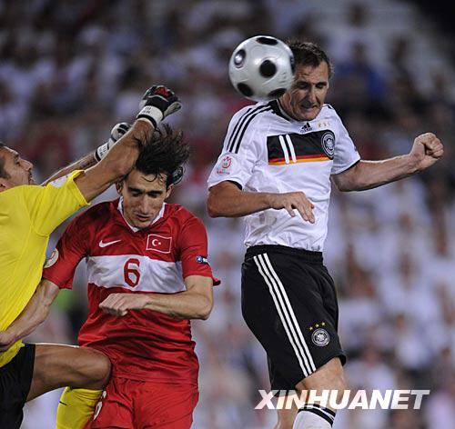 6月25日,德国队球员米·克洛泽(左)与队友庆祝进球。当日,德国队在瑞士巴塞尔举行的2008欧洲足球锦标赛半决赛中以3比2战胜土耳其队,晋级决赛。 新华社记者 吕明响摄