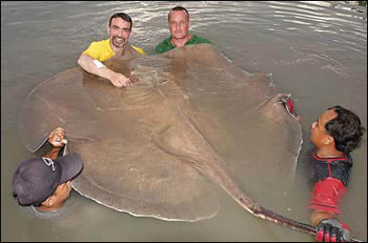 据英国每日电讯报道,一名英国钓鱼者在泰国一偏僻河流中捕获巨型黄貂鱼,也许是迄今为止人类捕获到的最大淡水鱼类。 这名叫伊恩·韦尔奇的钓鱼者和他的四个同事 花了45分钟才把这条宽6英尺(约1.8米),长14英尺(约4.2米)的大鱼(1英尺=30.48厘米)制服。 现年45岁的韦尔奇是从事淡水鱼类研究的博士,他和同事在把鱼拖上水面做了测量之后,又把鱼放生回河里。来源:网易探索 |
