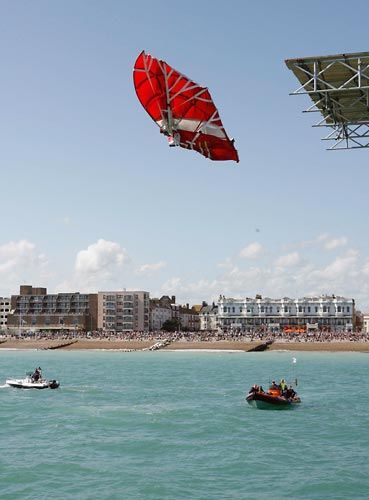 国际鸟人大赛英国举行,现场人山人海 参赛者在做准备 参赛者准备起跳 参赛者飞在空中向海中扎下 参赛者落入海中 一年一度的国际“鸟人”大赛日前在英国渥新码头举行,来自世界各地的参赛者展开自制的“翅膀”一跃而起,在空中滑翔数秒钟后再一头扎进海水中。 据英国《每日电讯报》7月6日报道,当天至少有1万名观众聚集在英国西苏塞克斯海滩观看比赛。按照比赛规则,参赛者在从码头上一跃而起至掉入海水中前,谁飞得最远,谁就是冠军。 本届大赛中,来自萨里郡的迪恩·冈,凭借自制的悬挂滑翔机在空中滑翔了30.5码(近27.9米),一举夺得冠军。据说,参赛选手倘若能够飞出100米远,就可赢得最高30000英镑(约合45万元人民币)的奖金。来源:新快报 |