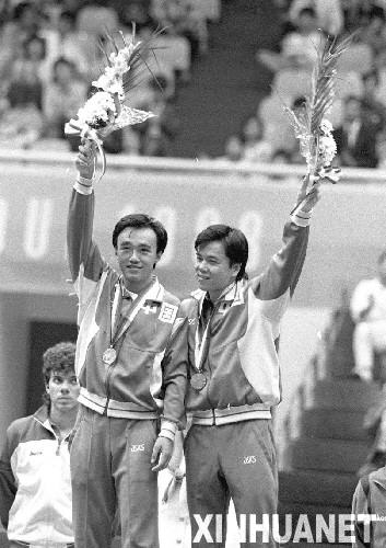图为陈龙灿、韦晴光在颁奖仪式上向观众挥手致意。 1988年9月30日,陈龙灿/韦晴光获得第24届汉城奥运会乒乓球男子双打金牌。新华社发 第20枚金牌