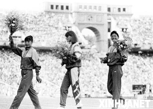 图为1984年8月7日,中国女排登上第23届洛杉矶奥运会女排冠军领奖台,夺得世界大赛“三连冠”。 新华社发 第15枚金牌