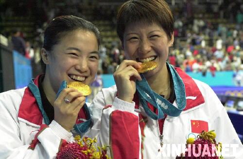 图为伏明霞在比赛中。 1992年7月27日,伏明霞获第25届巴塞罗那奥运会女子10米跳台跳水金牌。新华社发 第23枚金牌 图为王义夫开赛前同他的妻子张秋萍在一起。 1992年7月28日,王义夫获得第25届巴塞罗那奥运会男子气手枪比赛冠军。新华社发 第24枚金牌 图为张山在赛后向观众招手致意。 1992年7月28日,张山获第25届巴塞罗那奥运会双向飞碟比赛金牌。新华社发 第25枚金牌 这是钱红(上)在比赛中。 1992年7月29日,钱红获第25届巴塞罗那奥运会女子100米蝶泳金牌。新华社发 第26枚金牌 图为林莉在比赛中。 1992年7月30日,林莉获第25届巴塞罗那奥运会女子200米混合泳金牌。新华社发 第27枚金牌 图为杨文意(左)和庄泳在领奖台上向观众致意。 1992年7月31日,杨文意获第25届巴塞罗那奥运会女子50米自由泳金牌。新华社发 第28枚金牌 图为陆莉在比赛中。 1992年8月1日,陆莉获第25届巴塞罗那奥运会高低杠金牌。新华社发 第29枚金牌 图为李小双站在领奖台上向观众致意。 1992年8月2日,李小双获第25届巴塞罗那奥运会男子自由体操金牌。新华社发 第30枚金牌 图为庄晓岩在决赛前从容整理头发,准备一搏。 1992年7月27日,庄晓岩获第25届巴塞罗那奥运会女子柔道72公斤以上级金牌。新华社发 第31枚金牌 图为邓亚萍(左)、乔红在比赛中。 1992年8月3日,邓亚萍/乔红获第25届巴塞罗那奥运会乒乓球女子双打金牌。新华社发 第32枚金牌 图为高敏(左)手拿金牌向观众致意。 1992年8月3日,高敏获第25届巴塞罗那奥运会女子3米跳板跳水金牌。新华社发 第33枚金牌 图为陈跃玲(左)向观众致意。 1992年8月3日,陈跃玲获第25届巴塞罗那奥运会女子10公里竞走金牌。新华社发 第34枚金牌 图为吕林(右)、王涛在比赛中。 1992年8月4日,吕林/王涛获第25届巴塞罗那奥运会乒乓球男子双打金牌。新华社发 第35枚金牌 图为孙淑伟在比赛中。 1992年8月4日,孙淑伟获第25届巴塞罗那奥运会男子10米跳台跳水金牌。新华社发 第36枚金牌 图为邓亚萍在比赛中。 1992年8月5日,邓亚萍获第25届巴塞罗那奥运会乒乓球女子单打金牌。新华社发 第37枚金牌 图为孙福明在领奖台上。 1996年7月20日,孙福明获第26届亚特大奥运会女子柔道72公斤以上级金牌。新华社发 第38枚金牌 图为乐静宜(上)到达终点后激动不已。 1996年7月20日,乐静宜获第26届亚特兰大奥运会女子100米自由泳金牌。新华社发 第39枚金牌 图为唐灵生在比赛中。 1996年7月21日,唐灵生获第26届亚特兰大奥运会男子59公斤级举重比赛金牌。新华社发 第40枚金牌 图为占旭刚在领奖台上。 1996年7月23日,占旭刚获第26届亚特兰大奥运会男子70公斤级举重比赛金牌。新华社发 第41枚金牌 图为教练黄玉斌(右三)和白远韶(左一)激动地把李小双举上肩头。 1996年7月24日,李小双获第26届亚特兰大奥运会男子体操个人全能金牌。新华社发 第42枚金牌 图为李对红(左)在比赛中。 1996年7月26日,李对红获第26届亚特兰大奥运会女子25米运动手枪金牌。新华社发 第43枚金牌 图为杨凌(右)与获银牌的中国运动员肖俊挥舞鲜花向观众致意。 1996年7月26日,杨凌获第26届亚特兰大奥运会射击男子10米移动靶金牌。新华社发 第44枚金牌 图为伏明霞在10米跳台跳水比赛中。 伏明霞在第26届亚特兰大奥运会上夺得女子10米跳台和3米跳板两枚金牌。新华社发 第45枚金牌 图为王军霞夺冠后身披五星红旗向观众致意。 1996年7月28日,王军霞获第26届亚特兰大奥运会女子5000米金牌。新华社发 第46枚金牌 图为熊倪在比赛中。 1996年7月29日,熊倪获第26届亚特兰大奥运会男子3米板跳水金牌。新华社发 第47枚金牌 图为邓亚萍(左)、乔红在比赛中。 1996年7月29日,邓亚萍/乔红获第26届亚特兰大奥运会乒乓球女子双打金牌。新华社发 第48枚金牌 图为孔令辉(上右)、刘国梁在领奖台上。 1996年7月30日,孔令辉/刘国梁获第26届亚特兰大奥运会乒乓球男子双打金牌。新华社发 第49枚金牌 图为葛菲(左)、顾俊在领奖台上向观众致意。 1996年7月31日,葛菲/顾俊获第26届亚特兰大奥运会羽毛球女子双打金牌。新华社发 第50枚金牌 图为时任国际奥委会主席的萨马兰奇亲自为邓亚萍颁奖。 1996年7月31日,邓亚萍获第26届亚特兰大奥运会乒乓球女子单打金牌。新华社发 第51枚金牌 图为伏明霞在领奖台上。 1996年7月27日和7月31日,伏明霞在第26届亚特兰大奥运会上分别夺得女子10米跳台和3米跳板两枚金牌。新华社发 第52枚金牌 图为刘国梁在比赛中。 1996年8月1日,刘国梁获第26届亚特兰大奥运会乒乓球男子单打金牌。新华社发 第53枚金牌 图为陶璐娜(中)与获得银牌的南斯拉夫选手雅·塞卡里奇茨(左)及获得铜牌的澳大利亚选手安·福尔德在领奖台上。 2000年9月17日,陶璐娜获第27届悉尼奥运会女子10米气手枪比赛金牌。新华社发 第54枚金牌 图为蔡亚林在领奖台上。 2000年9月18日,蔡亚林获第27届悉尼奥运会男子10米气步枪比赛金牌。新华社发 第55枚金牌 图为杨霞(左)在颁奖仪式后与教练沙峰在一起。 2000年9月18日,杨霞获第27届悉尼奥运会举重女子53公斤级金牌。新华社发 第56枚金牌 图为中国男子体操队的队员们在领奖台上欢呼胜利。 2000年9月18日,中国男子体操队获第27届悉尼奥运会体操男子团体比赛金牌。新华社发 第57枚金牌 图为陈晓敏在比赛中。 2000年9月19日,陈晓敏获第27届悉尼奥运会举重女子63公斤级比赛金牌。新