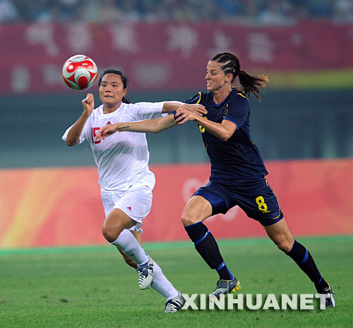 8月6日,中国女足球员浦玮(左)与瑞典队球员索布罗拼抢。新华社记者杨宗友摄 |