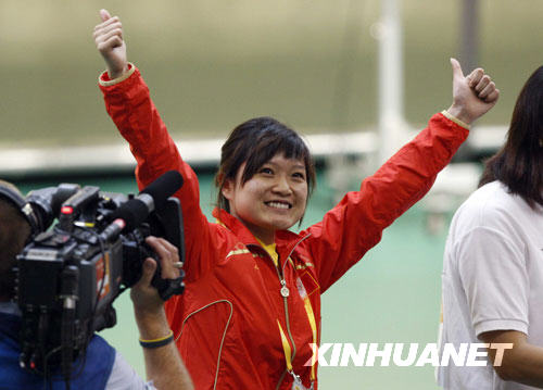 8月10日,中国选手郭文珺在庆祝胜利。当日,在北京奥运会射击女子10米气手枪比赛中,中国选手郭文珺获得金牌。新华社记者 鲍菲菲摄