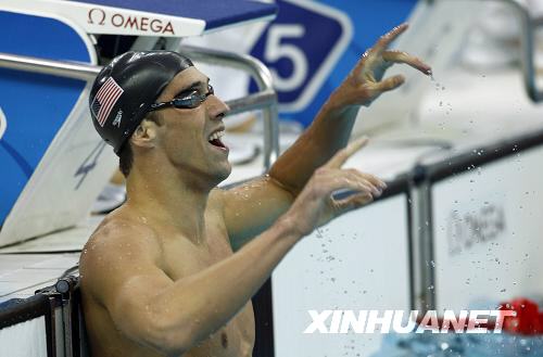 8月10日,美国选手迈·菲尔普斯赛后庆祝胜利。 当日,美国选手迈·菲尔普斯赛后庆祝胜利,他在男子400米个人混合泳决赛中,以4分03秒84的成绩获得冠军,并打破世界纪录。这是北京奥运会首枚游泳比赛金牌。新华社记者丁旭摄