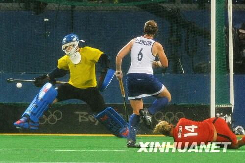8月10日,英国队守门员贝丝·斯托里(左)在比赛中扑救失利。当日,在北京奥运会女子曲棍球预赛中,德国队以5以1战胜英国队。新华社记者李勇摄