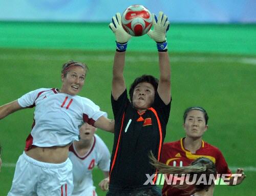 8月10日,中国队守门员张艳茹在比赛中摘球。当日,在天津奥林匹克中心体育场举行的北京奥运会女足小组赛中,中国队与加拿大队1比1战平。 新华社记者王晔彪摄