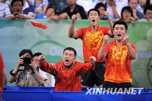 乒乓球——中国男团摘金 8月18日,中国选手王皓在比赛中庆祝得分。当日,中国队在北京奥运会乒乓球男子团体决赛中以3比0战胜德国队,摘得金牌。新华社记者徐家军摄 8月18日,中国选手王皓在比赛中。当日,中国队在北京奥运会乒乓球男子团体决赛中以3比0战胜德国队,摘得金牌。 新华社记者徐昱摄 8月18日,中国队员和教练欢呼胜利。当日,中国队在北京奥运会乒乓球男子团体决赛中以3比0战胜德国队,摘得金牌。新华社记者徐昱摄 8月18日,中国选手马琳庆祝胜利。当日,中国队在北京奥运会乒乓球男子团体决赛中以3比0战胜德国队,摘得金牌。新华社记者罗晓光摄 8月18日,中国队员和教练欢呼胜利。当日,中国队在北京奥运会乒乓球男子团体决赛中以3比0战胜德国队,摘得金牌。新华社记者罗晓光摄 8月18日,中国选手王皓在比赛中。当日,中国队在北京奥运会乒乓球男子团体决赛中以3比0战胜德国队,摘得金牌。新华社记者徐家军摄 |