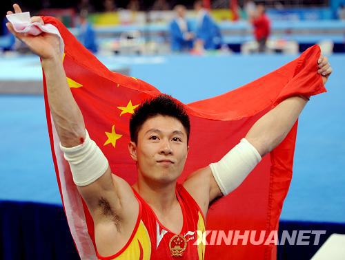 8月19日,中国选手李小鹏夺冠后高举五星红旗庆祝。当日,中国选手李小鹏在国家体育馆进行的北京奥运会体操男子双杠决赛中以16.450分的成绩夺得冠军。 新华社记者程敏摄