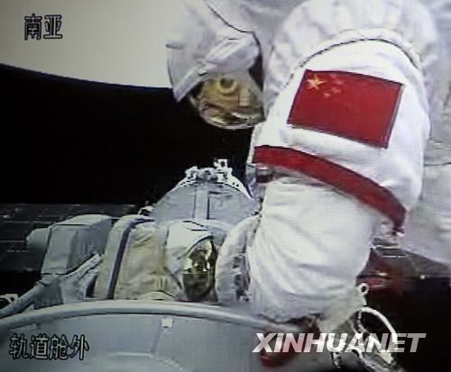 9月27日,执行神舟七号载人航天飞行出舱活动任务的航天员翟志刚顺利出舱(摄于北京航天飞行控制中心大屏幕)。新华社记者查春明摄 9月27日,执行神舟七号载人航天飞行出舱活动任务的航天员翟志刚顺利出舱,刘伯明在舱内配合其活动(摄于北京航天飞行控制中心大屏幕)。新华社记者查春明摄 9月27日,执行神舟七号载人航天飞行出舱活动任务的航天员翟志刚出舱后挥动中国国旗(摄于北京航天飞行控制中心大屏幕)。新华社记者查春明摄 |