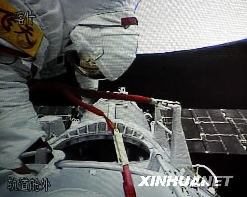 9月27日,执行神舟七号载人航天飞行出舱活动任务的航天员翟志刚顺利出舱(摄于北京航天飞行控制中心大屏幕)。 新华社记者查春明摄 9月27日,执行神舟七号载人航天飞行出舱活动任务的航天员翟志刚在舱外挥动中国国旗。 新华社发(电视截图) |