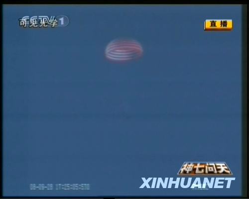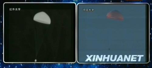 9月28日,神七返回舱主降落伞打开。 新华社发(电视截图)