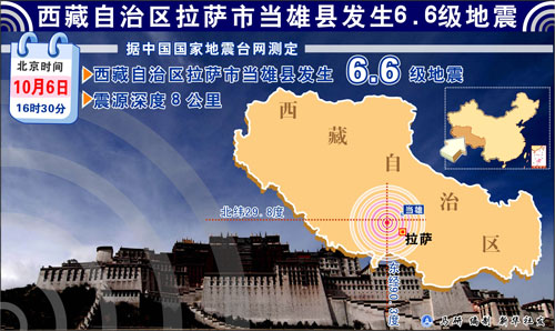 这是10月6日拍摄的当雄县格达乡受损的房屋。西藏当雄县6.6级地震震区格达乡有人员死亡,上百间房屋倒塌。 格达乡交通、通讯中断,西藏自治区政府已协调解放军部队前往救援,并紧急派出医疗队赶赴现场。拉萨市当雄县发生地震后,西藏自治区党委、政府高度重视,立即成立了应急指挥部,并于第一时间启动自治区2级应急响应。 新华社记者 普布扎西摄 10月6日,西藏当雄县的一名牧民带着孩子从倒塌的房屋旁走过。新华社记者 普布扎西摄 图表:西藏自治区拉萨市当雄县发生6.6级地震。新华社发 新华网拉萨10月6日电(记者颜园园、贾立君、觉果)记者从西藏自治区地震局获悉,6日16时30分在拉萨市当雄县境内发生6.6级地震,西藏拉萨、日喀则、山南等地有明显震感。 地震发生后,西藏采取措施积极应对,并立即启动了二级应急响应预案,成立抗震救灾指挥部。拉萨市部分小学也提前让学生放学回家。 据西藏自治区地震局局长朱荃介绍,震中的地震烈度为8度,估计会对地表造成破坏,可能有局部出现房屋倒塌。拉萨市地震烈度为5度,住在高楼的人们会感到震动。 地震发生时,记者正位于拉萨朵森格路的新华社西藏分社大楼4楼,感到明显的震动后,大家纷纷从楼上跑到院子里。记者随后看到,拉萨市民纷纷从楼内跑出来,聚集在街上。惊恐未定的人们拿起电话向家人了解情况,造成一时的网络拥塞,一段时间内很难拨通电话。 |