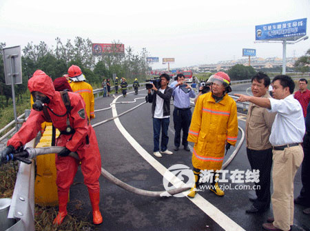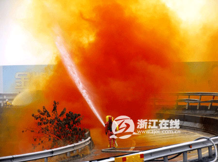 杭甬高速宁波段槽罐车侧翻 29吨硝酸泄漏