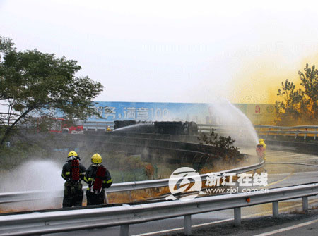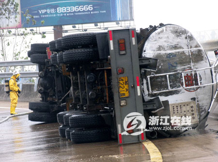 杭甬高速宁波段槽罐车侧翻 29吨硝酸泄漏