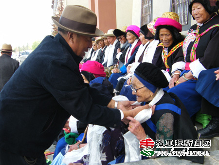 给老寿星敬献哈达。(王维韬 摄) 农历九月初九是一年一度的重阳节,也是敬老节。当日,600多名老人在月光广场参加了由香格里拉县建塘镇城区老年协会主办的敬老节活动。 据了解,老人们主要来自建塘镇金龙社区、仓房社区、北门社区、建塘社区和北郊社区,老年协会邀请了武警云南某部的官兵代表参加了此次活动。老年协会还给58位80岁以上的老人敬献了哈达,表达了对老寿星们的祝福之情。武警云南某部代表在敬老节上给老年协会敬献了锦旗,老年协会也以唱敬酒歌和献哈达的方式,赞颂了武警云南某部为维护香格里拉稳定所作出的贡献。 下午,老人们还观看了各社区编排的文艺节目。(记者 王维韬) |