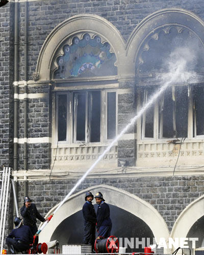 图为消防人员在孟买泰姬玛哈酒店外灭火 2008年11月29日 印度军方宣布在孟买泰姬玛哈酒店的清剿行动已经结束 新华社 王晔摄 |