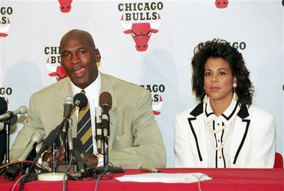 乔丹与胡安丽塔 乔丹/胡安丽塔:飞人与妻子劳燕分飞 年龄差:4岁 1985年,在乔丹加盟公牛队的第二个赛季,他与胡安丽塔相识于芝加哥的一家餐馆。1988年,乔丹和胡安丽塔交往密切,结果胡安丽塔珠胎暗结。当有着5个月身孕的胡安丽塔要求乔丹与她完婚时,乔丹却支吾敷衍。无奈之下,胡安丽塔只能聘请律师,要求乔丹对肚子里的孩子履行义务。在法律面前,乔丹只好乖乖地和胡安丽塔步入礼堂。胡安丽塔为乔丹生育了3个孩子,杰弗里、马库斯以及女儿加斯敏。 2002年,胡安丽塔提出离婚,要求获得对3个孩子的永久监护权、位于高地公园2.5万平方英尺(约合2322平方米)的住宅,以及两人全部财产的一半,总值大约为2亿美元,当时乔丹毫不犹豫地表示拒绝,因为“那会让乔丹伤心欲绝”。 在拖了四年之后,2006年12月乔丹夫妇通过律师,以共同的名义发表了最后一份公告,“乔丹与胡安丽塔默契的,平和的决定结束他们17年的婚姻,而对于离婚的判决从今天起生效,不会再有其他公告了。”乔丹伤心地说道:“我们试图调解,但失败了,而且对于未来来说,调解是不实现的,对家庭也不利。”法院判定两人共同抚养3位孩子,并对两人的监护时间分配、财产分配都做出了判决,但由于乔丹的特别申请,这些细节都没有被公布。