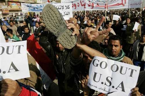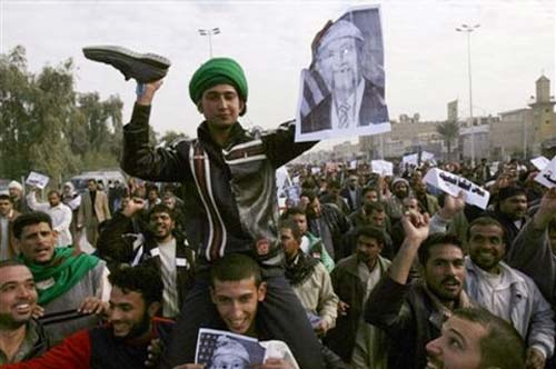 伊拉克民众走上街头游行示威,对访问巴格达市萨德尔城的美国总统布什表示反对。据悉,在阿拉伯社会,向别人展示鞋底是一种极不尊重他人的行为。(来源:国际在线)