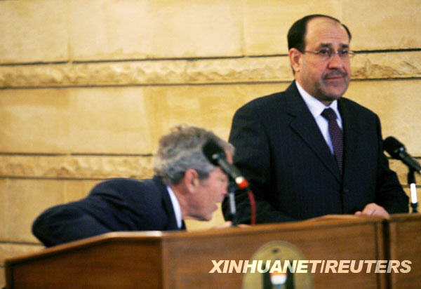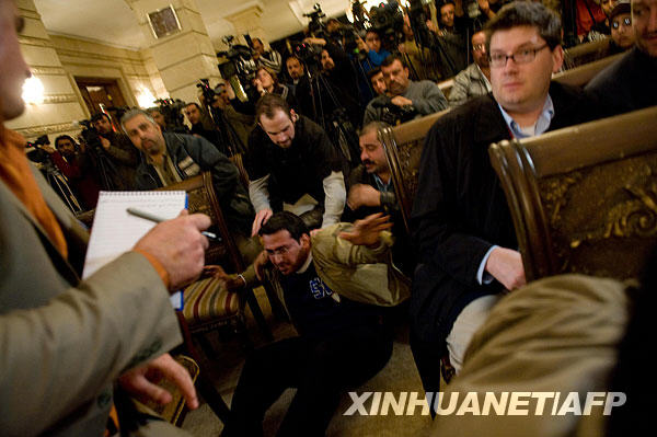 12月14日,在伊拉克首都巴格达,一名袭击美国总统布什的伊拉克记者(中)被按倒在地。当日,一名伊拉克记者在布什与伊拉克总理努里·马利基召开的联合新闻发布会上脱下自己的鞋,扔向布什。 新华社/法新