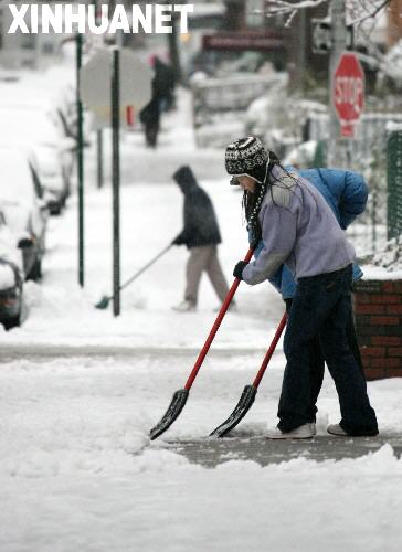 12月19日,美国纽约居民在自家门前扫雪。当日,纽约遭遇暴风雪袭击,市区降雪约13厘米,导致一些学校停课,部分道路封闭,数百架航班取消。连日来,美国从中西部到东北部遭遇大范围暴风雪袭击。 新华社记者 侯俊 摄