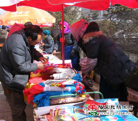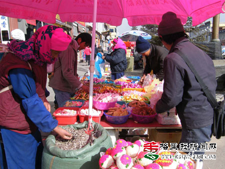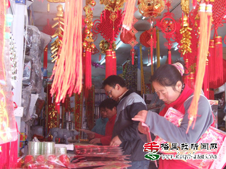 虽然离春节还有半个月的时间,但香格里拉各大超市和街道都已迫不及待地摆满了年画、糖果等年货,让香格里拉充满了浓浓的“年味”。(王维韬 摄) |