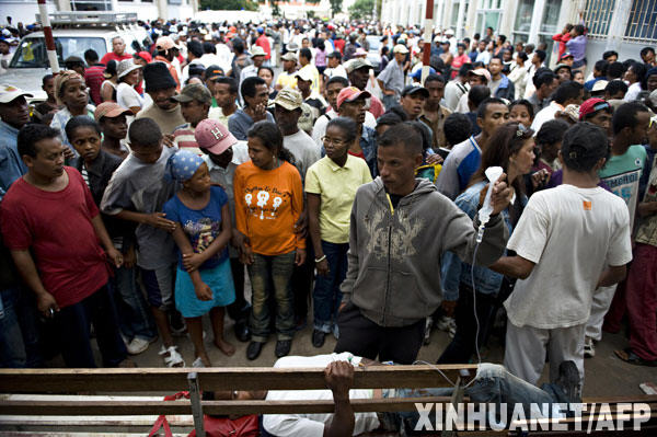 2月7日,在马达加斯加首都塔那那利佛,一名伤者在医院外的长椅上接受治疗,大批民众守候在这里等待了解亲属的医治情况。当天,塔那那利佛发生大规模流血冲突,总统卫队向试图进入总统府的示威民众开枪,导致300多人死伤。新华社/法新 |