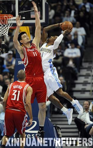 3月9日,火箭队球员姚明(中)在防守掘金队球员史密斯(右)的上篮。当日,在NBA常规赛中,休斯敦火箭队客场以97比95战胜丹佛掘金队。新华社/路透