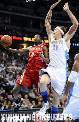 3月9日,火箭队球员布鲁克斯(左)在比赛中突破上篮。当日,在NBA常规赛中,休斯敦火箭队客场以97比95战胜丹佛掘金队。新华社/路透