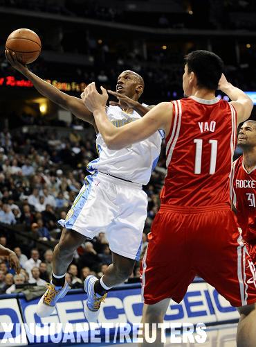 3月9日,火箭队球员姚明(中)在防守掘金队球员比卢普斯。当日,在NBA常规赛中,休斯敦火箭队客场以97比95战胜丹佛掘金队。新华社/路透