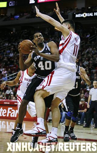 3月14日,火箭队球员姚明(右)防守马刺队球员托马斯。当日,NBA常规赛中,休斯敦火箭队主场迎战圣安东尼奥马刺队。新华社/路透