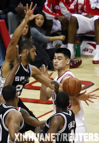 3月14日,火箭队球员姚明(右上)与马刺队球员争抢篮板球。当日,在NBA常规赛中,休斯敦火箭队主场以85比88不敌圣安东尼奥马刺队。新华社/路透