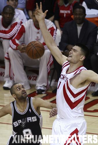 3月14日,火箭队球员姚明(右)与马刺队球员帕克争抢。当日,在NBA常规赛中,休斯敦火箭队主场以85比88不敌圣安东尼奥马刺队。新华社/路透