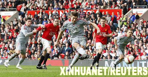 3月14日,利物浦队球员杰拉德(中)点球得分的瞬间。当日,在英超联赛第29轮比赛中,利物浦队客场以4比1战胜曼彻斯特联队。