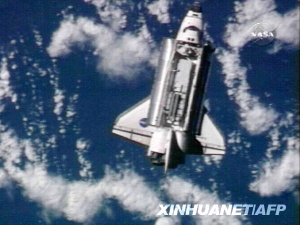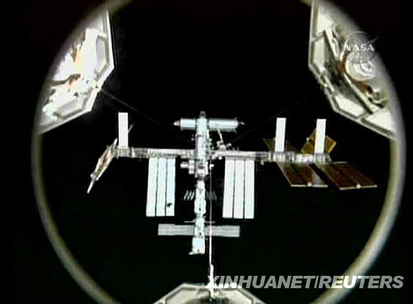 这张美国国家航空和航天局3月17日发布的电视截图显示,美国“发现”号航天飞机正在与国际空间站对接。美国东部时间17日17时19分(北京时间18日5时19分),美国“发现”号航天飞机成功与国际空间站对接。新华社/路透