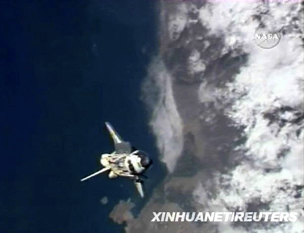 这张美国国家航空和航天局3月17日发布的电视截图显示,美国“发现”号航天飞机准备与国际空间站对接。新华社/路透