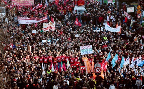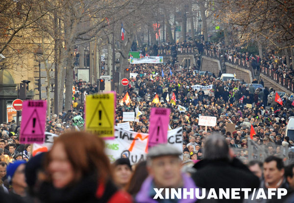 资料图:当地时间1月29日,法国爆发了金融危机以来第一次大规模的罢工活动,上百万人走上街头,抗议萨科齐政府在处理金融危机中的无能表现。(来源:中国新闻网)