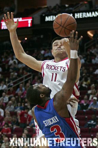 3月18日,休斯顿火箭队队员姚明(上)在比赛中封盖底特律活塞队队员斯塔基的上篮。当日,休斯顿火箭队在NBA常规赛中对阵底特律活塞队,最终火箭经双加时106-101战胜活塞。新华社/路透