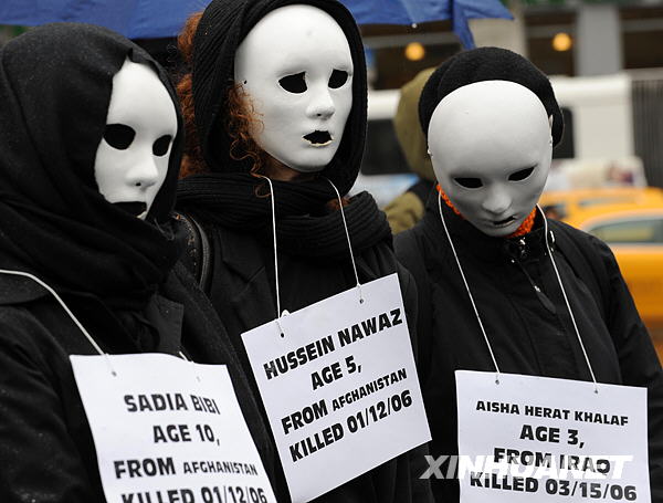 3月19日,反战人士头戴面具,胸前挂着在伊拉克战争和阿富汗战争中死去儿童的姓名牌子,在美国纽约联合广场参加抗议活动。新华社记者申宏摄