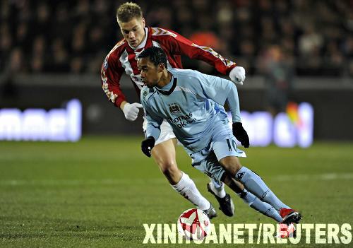 3月19日,英格兰曼彻斯特城队球员罗比尼奥(前)在比赛中带球突破。当日,在欧洲联盟杯足球赛八分之一决赛第二回合的比赛中,曼城队客场以0比2不敌丹麦奥尔堡队,双方以2比2的总比分战平。在最终的点球大战中,曼城队以4比3胜出,晋级八强。 新华社/路透 |
