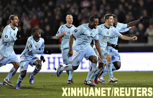 3月19日,英格兰曼彻斯特城队球员在比赛后庆祝胜利。当日,在欧洲联盟杯足球赛八分之一决赛第二回合的比赛中,曼城队客场以0比2不敌丹麦奥尔堡队,双方以2比2的总比分战平。在最终的点球大战中,曼城队以4比3胜出,晋级八强。 新华社/路透