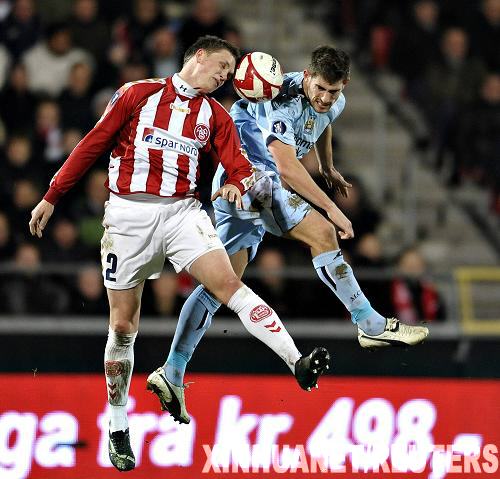 3月19日,英格兰曼彻斯特城队球员埃文斯(右)与丹麦奥尔堡队球员杰克布森争顶头球。当日,在欧洲联盟杯足球赛八分之一决赛第二回合的比赛中,曼城队客场以0比2不敌奥尔堡队,双方以2比2的总比分战平。在最终的点球大战中,曼城队以4比3胜出,晋级八强。 新华社/路透(来源:新华网) |