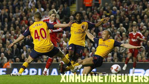 4月21日,利物浦队球员托雷斯(左二)射门得分的瞬间。当日,在英格兰足球超级联赛第33轮比赛中,阿森纳队客场以4比4战平利物浦队。新华社/路透