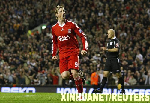 4月21日,利物浦队球员托雷斯庆祝进球。当日,在英格兰足球超级联赛第33轮比赛中,阿森纳队客场以4比4战平利物浦队。新华社/路透