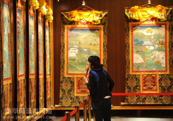 5月30日,游客在香格里拉文博中心观看格萨尔唐卡。 总投资2000多万元的千幅格萨尔唐卡近日在云南迪庆藏族自治州香格里拉县展出。格萨尔王是藏族人民崇拜的英雄和神的化身。此次展出的格萨尔唐卡依托格萨尔史诗为主线,通过200多名画师多年的精心绘制完成,以1288幅唐卡画卷讲述了藏族英雄格萨尔王从降生、征战到回归天界三个阶段的故事。(新华社记者 秦晴 摄)(来源:新华网云南频道) |