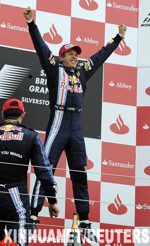 6月21日,红牛车队德国车手维特尔在领奖台上庆祝。当日,在2009世界一级方程式(F1)赛车锦标赛英国站比赛中,维特尔以1小时22分49秒328的成绩夺冠。新华社/路透