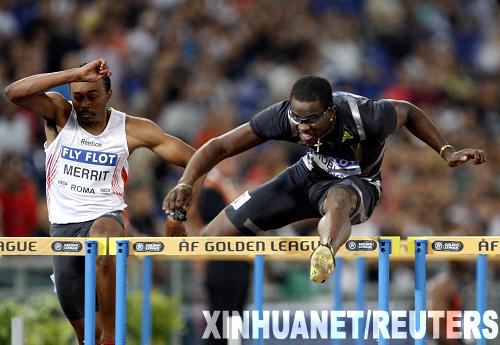7月10日,古巴选手罗伯斯(右)在男子110米栏决赛中率先冲过终点。当日,在国际田联黄金联赛罗马站的比赛中,罗伯斯以13秒17的成绩夺得男子110米栏冠军。新华社/路透 7月10日,古巴选手罗伯斯(右)在男子110米栏决赛中率先冲过终点。当日,在国际田联黄金联赛罗马站的比赛中,罗伯斯以13秒17的成绩夺得男子110米栏冠军。新华社/路透(来源:新华网) |