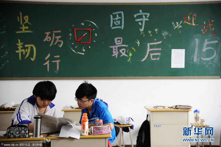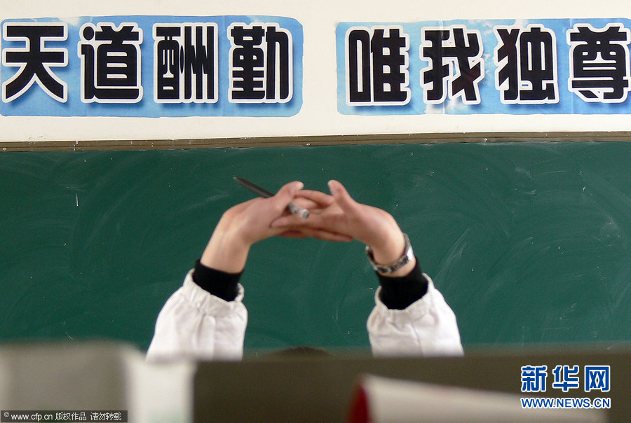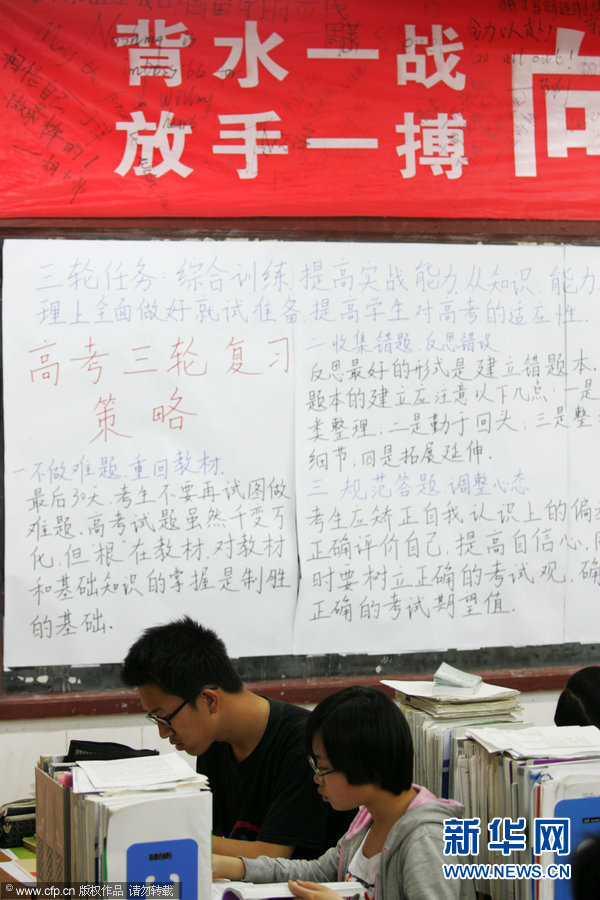 2011年4月13日,厦门市双十中学高三学生在教室里复习功课备战高考,充满刺激鼓动性的大标语,让复习更显得紧张。“要成功,先发疯,下定决心往前冲”。(图片来源:CFP)