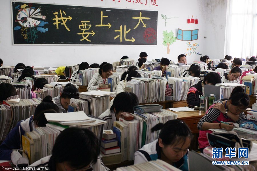2010年5月20日,在河南省淮阳县第一高级中学高三年级教室,即将参加高考的学生在堆满书山题海的书籍中加紧复习功课。(图片来源:CFP)